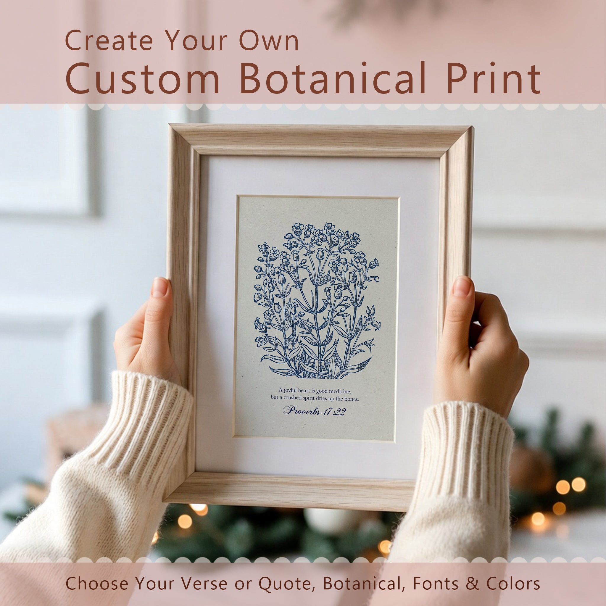 Create a custom botanical art print featuring your favorite Bible verse, quote, poem, or message. Personalize it with vintage botanical illustrations, curated fonts, and soft color palettes to create a meaningful, heartfelt gift and a beautiful addition to your home décor.