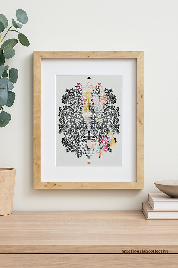 A new series inspired by symmetry, color, and transformation — where botanical linework and mirrored design come together in captivating balance. Each piece invites you to see nature’s beauty in a new light, blending art, renewal, and quiet wonder into timeless design.